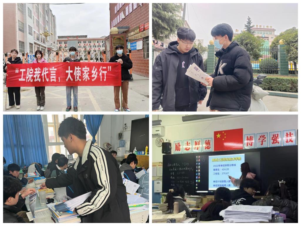 工院我代言,大使家乡行。为进一步做好学校招生宣传工作,充分调动广大青年学子在学校招生工作中的积极性,不断扩大学校社会影响力,提升学校社会声誉,青年学子化身工院“代言大使”,返回高中学校,从我校办学历史、教学设施、师资队伍、录取政策、就业优势等方面全方位宣传我校,彰显学校综合办学实力;从学校硬件环境设施、校园文化建设、科技文化活动、体育美育实践、各类学生社团等方面介绍我校的育人环境和文化氛围;从学校奖学金、助学金、绿色通道及生源地贷款等方面介绍学校的资助政策,体现学校对学生的人文关怀;从招生政策、复习备考方法及填报志愿等方面传授经验,为学弟学妹答疑解惑。