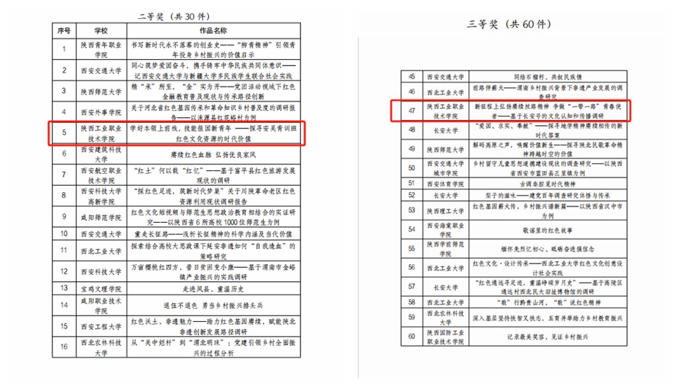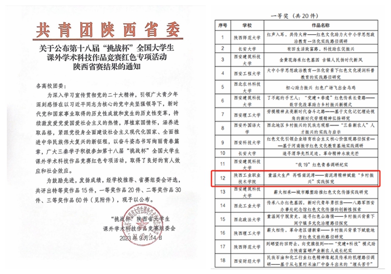 近日,第十八届“挑战杯”全国大学生课外学术科技作品竞赛红色专项活动陕西省赛结果公布,我校荣获一等奖1项,二等奖1项,三等奖1项,获奖数量位居全省高职院校首位。
