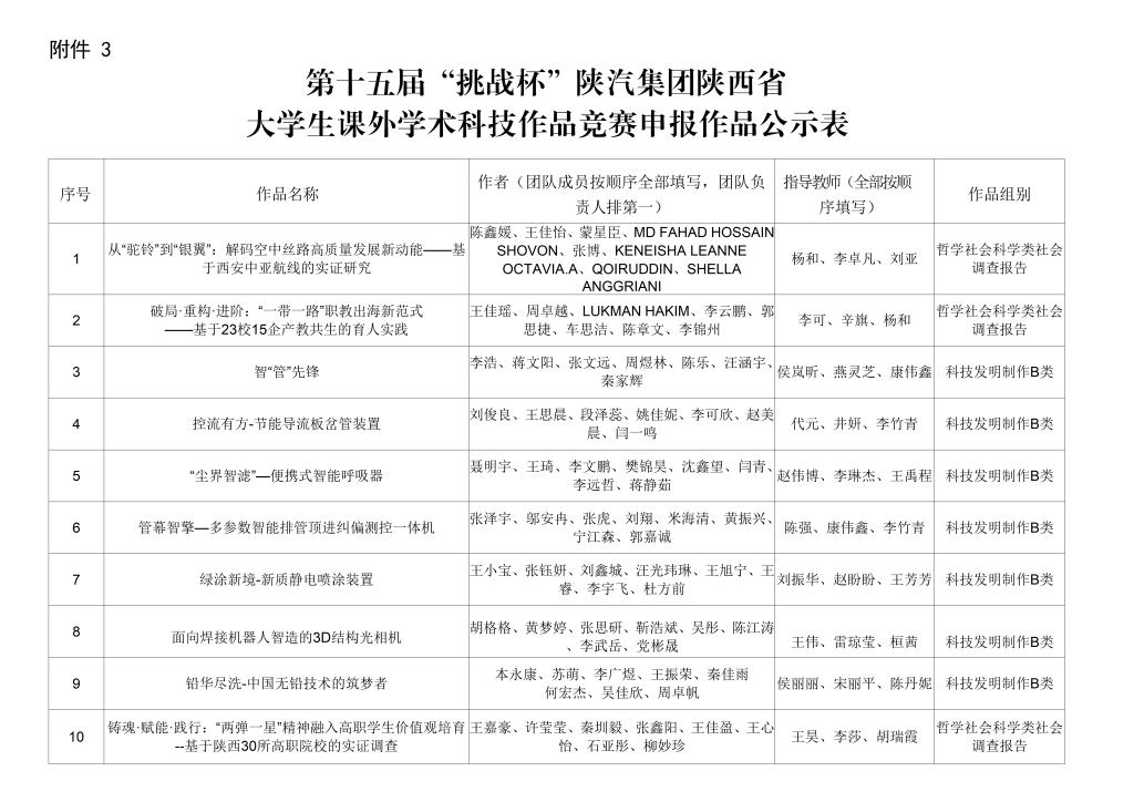 按照《关于组织开展第十五届“挑战杯”陕汽集团陕西省大学生课外学术科技作品竞赛的通知》(陕团联发[2025]10号)和我校《关于举办陕西工业职业技术学院2025年“挑战杯”大学生课外学术科技作品竞赛的通知》(陕工院院字[2024]172号)要求,经校内比赛评审和选拔,学校拟选报10个项目参加第十五届“挑战杯”陕汽集团陕西省大学生课外学术科技作品竞赛(名单附后)。