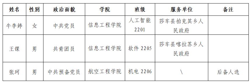 根据共青团陕西省委、陕西省教育厅、陕西省财政厅、陕西省人力资源和社会保障厅《关于印发<2025-2026年度陕西省大学生志愿服务西部计划实施方案>的通知》(陕团联发〔2025〕11号)以及相关工作进度安排,按照公正、公平、公开、择优原则,经过学生个人申请、资格审查、笔试、面试、心理测评等环节,最终拟确定牛李婷、王锞为我校拟推荐人选,张珂为后备人选。现予以公示,公示期5天,自6月16日至6月20日。若如对公示人选有异议,请于公示期内实名反映。