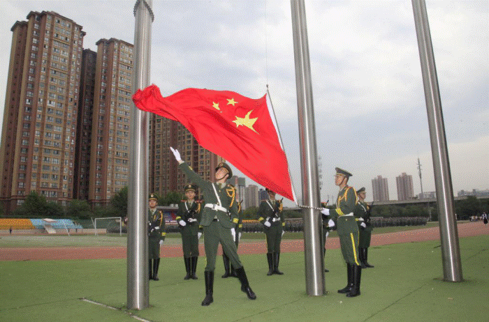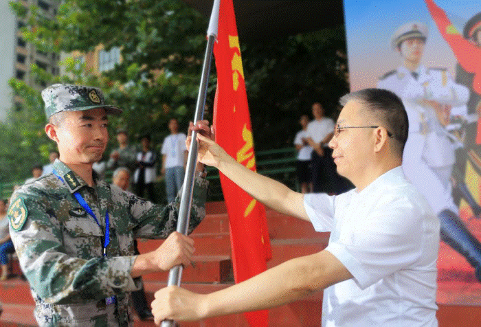 最后,学院副院长梅创社宣布军训团编制及任命。党委书记惠朝阳为新生军训团授旗并宣布2019级新生军训开营。