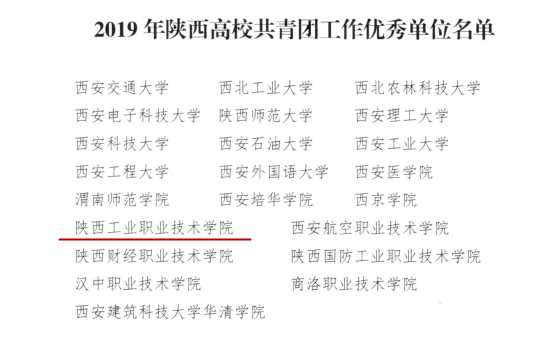 近日,共青团陕西省委、中共陕西省委教育工委联合下发《关于2019年度陕西高校共青团工作考核结果的通报》【陕团联发〔2020〕10号】,我院荣获“2019年度陕西高校共青团工作优秀单位”,党委副书记贺天柱荣获“2019年陕西高校支持共青团工作好书记(校长)”称号,信息工程学院团总支书记穆昌荣获“2019年陕西高校共青团工作先进个人”称号。